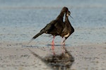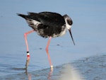 Pied stiltPoakaA compact, all-black stilt with long red legs and a long fine pointed black bill. Adult hybrid stilts have a black band of variable width across the breast.