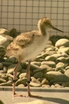 Kakī are a compact stilt, shorter legged and with a thicker bill than the more common pied stilt, which is entirely white below. Juvenile black stilts in their first winter plumage have a black back, smudgy grey hind neck and variable dark markings on the flank. This plumage darkens in their second summer moult, and by mid-summer they are predominantly black. Adult hybrid stilts have a distinctive black band across their breast, the width of black generally correlating with the amount of kakī genes in the individual.