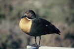 The chestnut-breasted shelduck is a frequent visitor to New Zealand. It is closely related to the endemic paradise shelduck with which it shares many plumage features. Chestnut-breasted shelducks often fly several hundred kilometres between breeding sites (used in winter and spring), to moulting sites, where they congregate in large numbers. Although apparently faithful to its nesting locations, the place where moult occurs can vary from year to year. Until the 1970s, it was known in Australia as the mountain duck, but is now most commonly referred to there as the Australian shelduck.