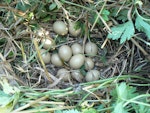 Common pheasants are solitary outside the breeding season. Males are polygamous, mating with a number of females and taking no part in nest building or incubation. The main breeding season is from October to December, but eggs have been found from July to March. The nest is a bowl-shaped indentation in grass, well hidden among vegetation. The average clutch size is 9 with a range of 7-15. Incubation takes 23-28 days; the chicks leave the nest when dry and are able to fly short distances after 12 days.