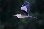 A large, tall grey heron with pointed yellow bill, white head and neck, thick black stripe behind the eye, black crest, pale grey underparts, and dark grey back. In flight, the dark grey body and forewings contrast with black flight feathers.