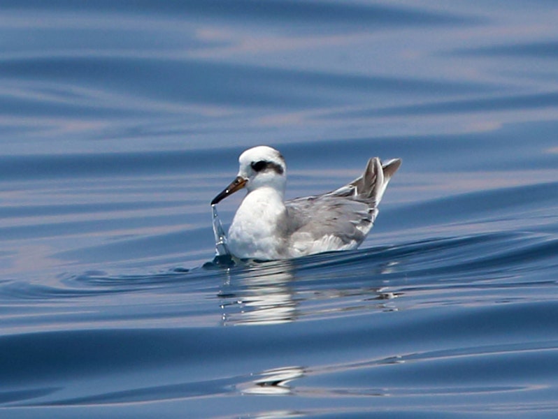 Red-necked phalaropeA small wading bird that is often seen swimming. Adult non-breeding birds have a black bill with yellow at the base, black patches behind the eyes and at the back of the crown, a white head, neck and underparts, pale silvery-grey underparts, and a darker grey tail.