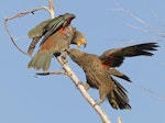 KākāKakaA large olive-green parrot with orange underwings and rump, a slender grey-black bill, and blue-green iridescence on the primary flight feathers. Females are 20% lighter than males with a shorter bill, and juveniles have a yellow cere, lower mandible and eyelids, which fade to grey as the bird matures.