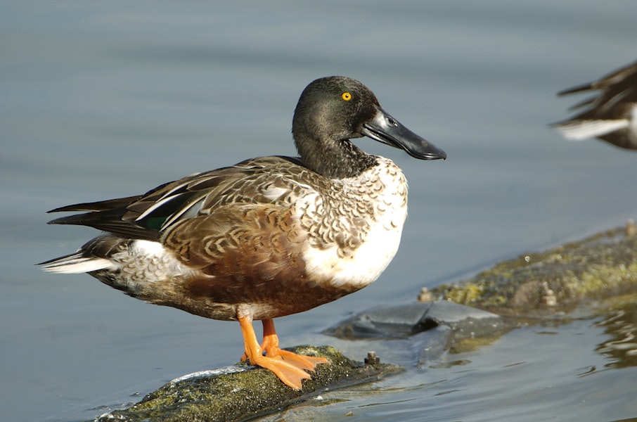Northern shovelers feed from the surface, filtering items from the water with fine comb-like ridges on the inside of their bills.