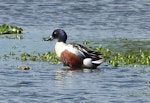 Similar species (adult males only): the Australasian shoveler is similar in size and shape. The drake Australasian shoveler has a blue-grey head with a vertical white crescent at the base of bill. But note that male northern shovelers in ‘eclipse’ plumage (a plumage attained for a short time after the breeding season) also may show a pale crescent on the face, as well as a speckled breast. The drake mallard has a similarly green head but has a dark maroon-brown breast and yellow bill.