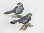 Similar species: the North Island kokako is paler, with (usually) blue wattles, an ashy grey edging to the facial mask. The few ‘orange wattled’ kōkako recorded in the North Island are assumed to be colour variants of C. wilsoni, the North Island kokako. Vagrant black-faced cuckoo-shrike from Australia is half the size, paler grey, lacks wattles, and is a bird of open woodlands, parks and gardens rather than dense native forest.