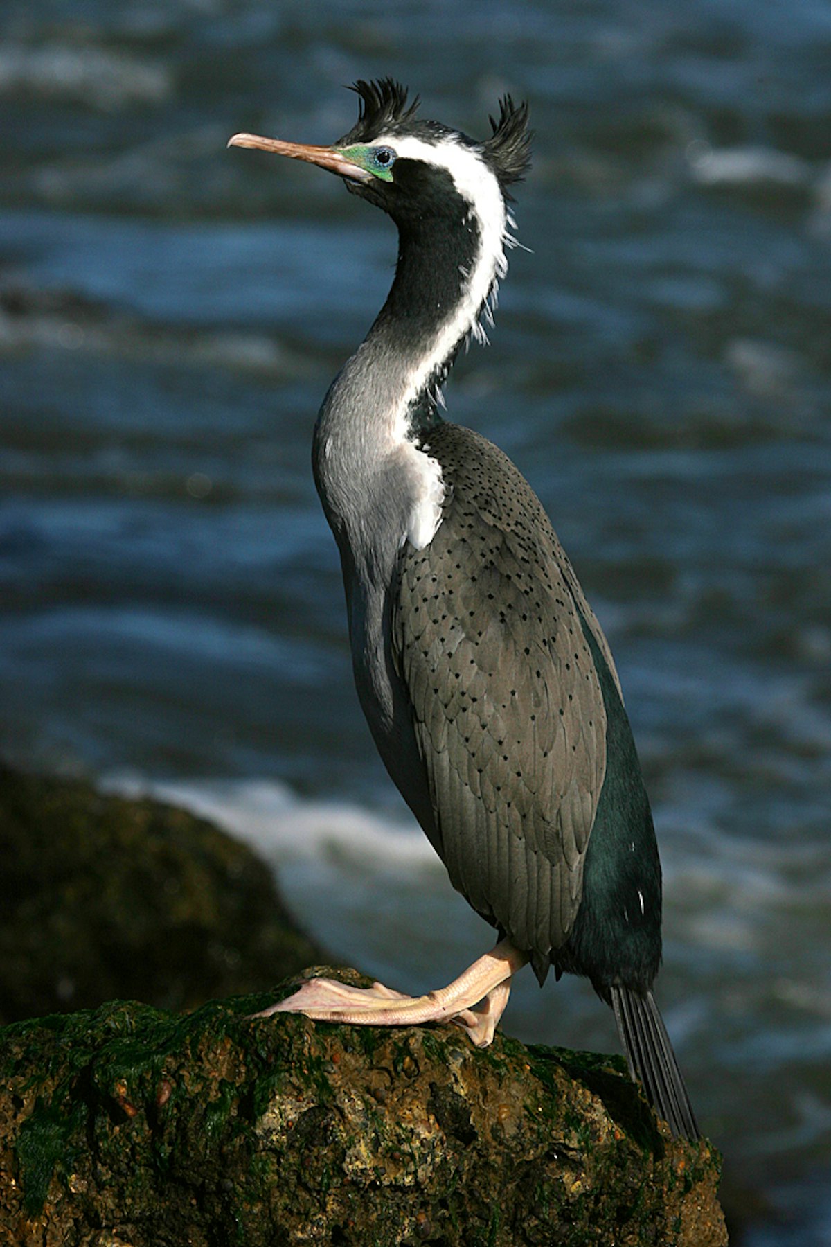 The spotted shag and closely related Pitt Island shag are the only yellow-footed shag species endemic to New Zealand. Adult spotted shags in breeding plumage are elegant and colourful, sporting a Mohican-like double crest, bright green-blue facial skin and blue eye rings. The species gets its name from the small black spots that appear near the tip of each back and wing covert feather during the breeding season. Spotted shags are entirely marine, breeding on the coasts of the North, South and Stewart Islands, and feeding in waters out to 16 km. Outside the breeding season, spotted shags form large feeding and roosting flocks of up to 2000 birds. Before 2019, spotted shag and Pitt Island shag were placed in their own genus (Stictocarbo). A DNA study published that year revealed that spotted shag and Pitt Island shag were embedded in the genus Phalacrocorax, closest to pied shag, black-faced shag (P. fuscescens) and little black shag.